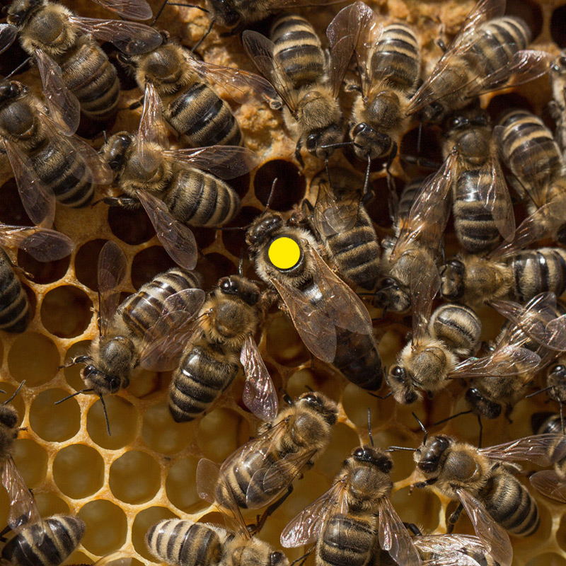 Der Imker kennzeichnet die Königin mit einer Farbplakette, um sie schneller zu finden. Die Farbe gibt ihn Die Farbe gibt Hinweis darauf in welchem Jahr die Königin geschlüpft ist.